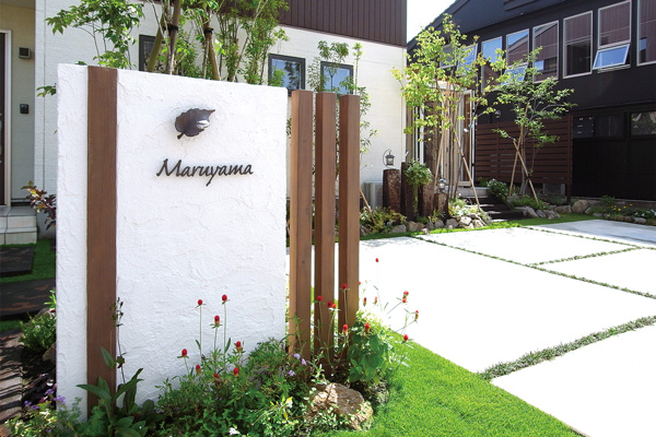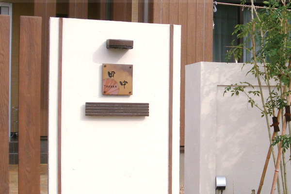 曲面にデザインした門袖には、同じく表面が少し曲面になっているデューン-Uがぴったり合います。白い壁に凹みを作り、木調テクスチャー上に表札を取付けたところが特徴です。