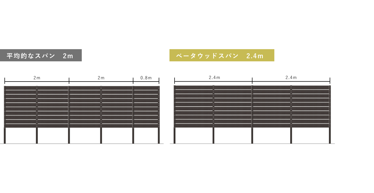 長さ2.4mの板材により柱の数を減らせます。距離が長くなるほどコスト面でメリットが大きくなります。