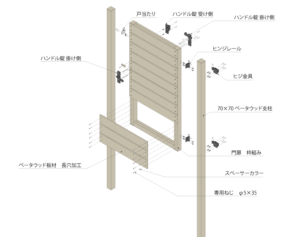 門扉支柱にはベータウッド支柱70×70を使用し、門扉はベータウッド支柱60×60と板材、門扉専用の部品を使って組み立てます。
