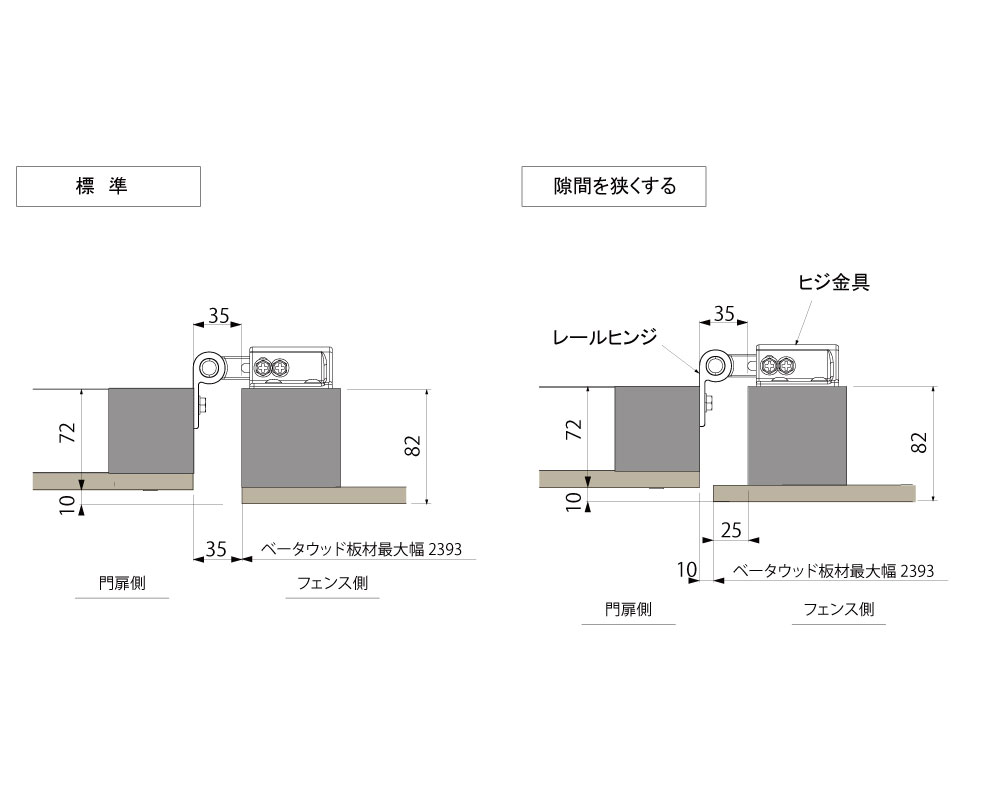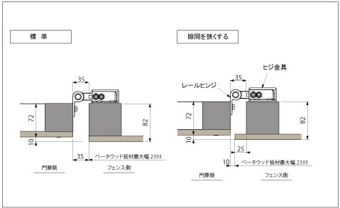 新しい吊元部品では、吊元の支柱と門扉の間に約35㎜の隙間ができます。
