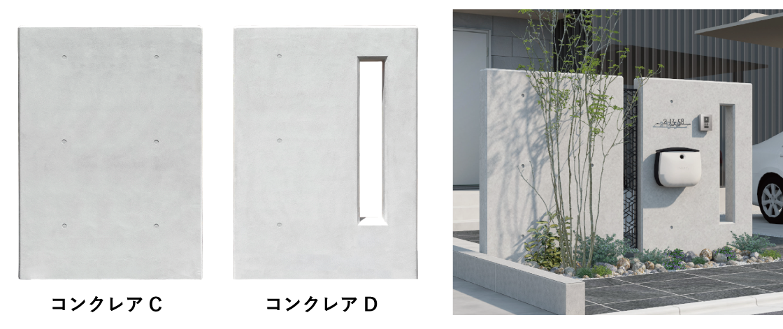 これまでサイズ(W1100×H1850×D150mm※GL上H1800mm)に加え、門袖に最適な【コンクレアC】【コンクレアD】(W1200×H1650×D150mm※GL上1600mm)をラインナップ。