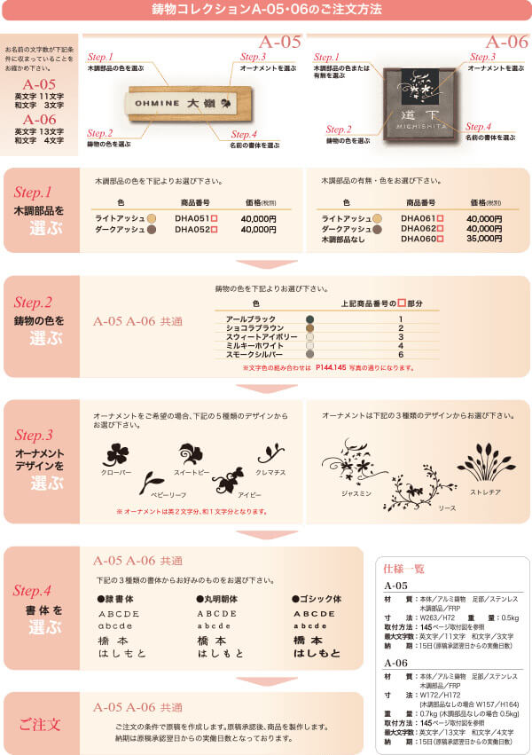 鋳物表札A-05は木調部品・鋳物の色・オーナメント・書体等を自由に組み合わせて楽しめる表札です。